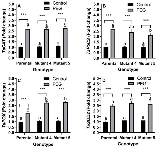 Effects of PEG-induced osmotic stress on the expression of the genes TaCAT (A), TaP5CS (B), TaPOX (C), and TaSOD2 (D) of the parental line (commercial cultivar) and its mutant lines 4 and 5. Values are the arithmetic means of biological triplicates (n = 3), and the error bars correspond to the standard deviations (sd). Columns indicated by different letters are statistically different (p < 0.05) at the same conditions (control or PEG). Significant differences were determined according to Tukey’s HSD test at *** p < 0.001.