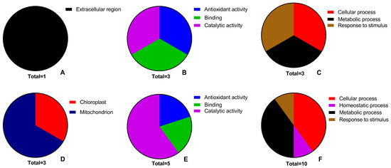 Gene ontology (GO) analyses. Pie charts show the PEG-induced GO terms of cellular component (A,D), molecular function (B,E) and biological process (C,F) in the parental line (A–C) and in the mutant lines (D–F).
