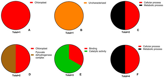 Three CC terms were assigned to the up-regulated proteins with one and three matches in the parental line and the mutant lines, respectively (Figure 4A,D). Up-regulated proteins in the mutant lines fell into two categories: “chloroplast, GO:0009507” or “mitochondrion, GO:0005739”. One up-regulated protein in the mutant line 4 has no CC term. One protein that is destined to “extracellular region, GO:0005576), was up-regulated in the parental line. Two CC terms were assigned to the down-regulated proteins with one and two matches in the parental line and the mutant lines, respectively (Figure 5A,D). Down-regulated proteins in the mutant lines fell into two categories: “chloroplast” and “PDC, GO:0045254”. One protein that is destined to “chloroplast” was down-regulated in the parental line.