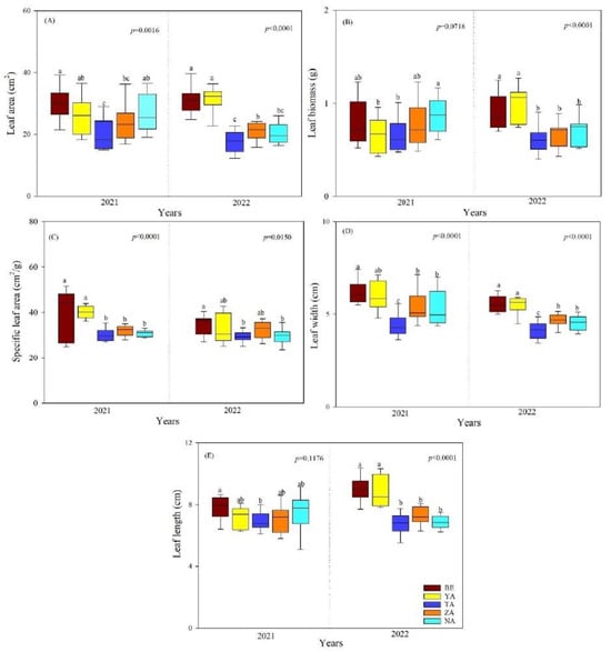 The leaf morphological traits of U. pumila across different urban study sites (BE-Beejin, YA-Yavuu, TA-Tasgan, ZA-Zanabazar, NA-Naadamchid) in Ulaanbaatar, Mongolia. Different lowercase letters indicate significant differences between study areas within the same year. (A) Leaf area (LA); (B) leaf biomass (LB); (C) specific leaf area (SLA); (D) leaf width (LW); and (E) leaf length (LL).