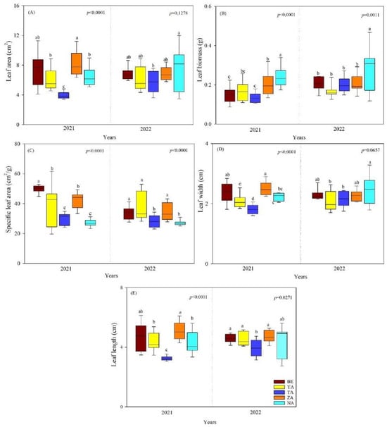 The SLA, LL (p < 0.01), and LW (p < 0.0001) were significantly different between the study years, and a reverse pattern was observed for LA and LB of P. laurifolia. The mean LA, LB, SLA, LW, and LL of P. laurifolia were significantly lower in the TA site than in other sites. In contrast, in BE site, they were higher (Figure 1A–E). The LB, LA, SLA, LW, and LL of P. laurifolia were also highly significant between the study sites. Specifically, the SLA and LA were lower in 2022 than in 2021 (Figure 1B,C).