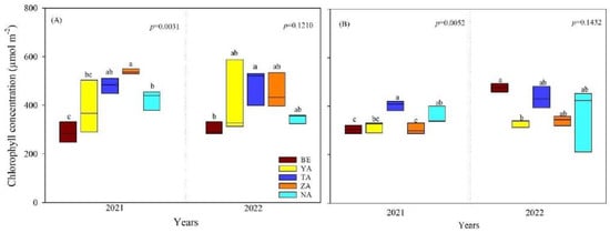 The leaf chlorophyll concentration of P. laurifolia and U. pumila ranged from 294.58 to 496.87 µmol m−2 and significantly varied between sites (p < 0.05, Table S1, Figure 3). The leaf chlorophyll concentration of both species differed significantly between sites only in 2021 (p < 0.05). Specifically, the leaf chlorophyll concentration of P. laurifolia at the ZA site was the highest, whereas U. pumila had a lower concentration. Contrarily, the leaf chlorophyll concentration of P. laurifolia growing in the BE site was the lowest.