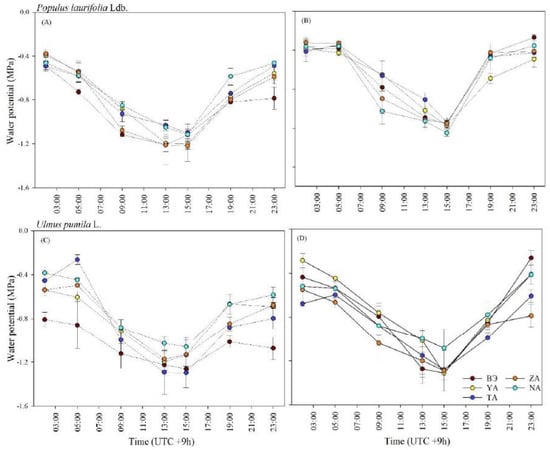 Diurnal variation in leaf water potential of P. laurifolia (A,B) and U. pumila (C,D) growing in the urban study sites measured in July 2019 and 2020 in Ulaanbaatar, Mongolia. Vertical bars represent standard error.