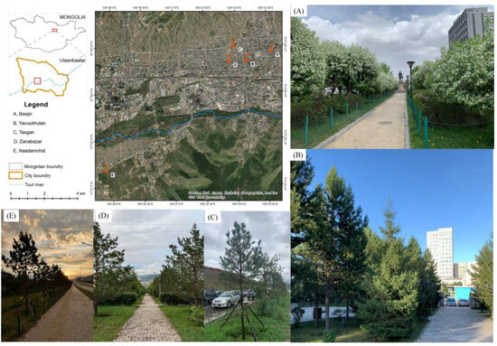 Location of the five contrasting urban sites (background image from Google Earth) showing (A) Beejin, (B) Yavuu, (C) Tasgan, (D) Zanabazar, and (E) Naadamchid sites in Ulaanbaatar, Mongolia.