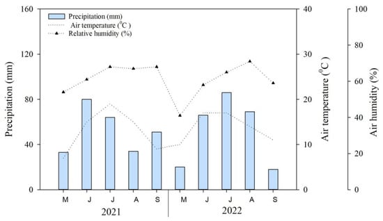The mean annual precipitation is about 250 mm, with over 80% occurring from June to September. During growing seasons, the average air temperature and precipitation of growing seasons (May–September) in 2021–2022 were 13.0–13.7 °C and 51.8–52.6 mm, respectively (Figure 6). The precipitation in July of 2022 exceeded that of July 2021 (c.a., 10–15%). The 2021–2022 meteorological data were obtained from the nearest weather station [46], which is approximately five kilometers away from the study site. The mean non-frost period is 90–110 days [47]. Moreover, the study area is characterized by dark kastanozem soil [48,49] and mollic leptosols by international soil classification [50].