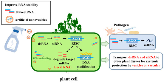 In the RNAi pathway, the use of exogenous RNA, such as double-stranded RNA (dsRNA) and microRNA (miRNA), can significantly boost plant resistance to pathogens by inducing post-transcriptional gene silencing (PTGS). Application of exogenous dsRNA has been shown to decrease the virulence of pathogens on untreated distal leaves, enabling systemic spread within the plant [9], and affecting gene expression in neighboring plants [10]. However, the effectiveness of sRNAs, whether exogenous or endogenous, is impacted by their stability and delivery efficiency.