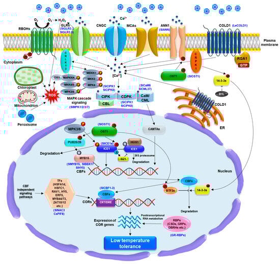 Overview of low temperature (LT) sensing, signaling transduction, and gene regulation via CBF-dependent or CBF–independent signaling pathway in planta. LT is considered to be sensed by the plasma membrane (PM)-and endoplasmic reticulum (ER) membrane-localized COLD1 (chilling tolerance divergence 1) with the interaction of rice G-protein subunit 1 (RGA1), which lead to Ca2+ influx into the cytoplasm. Arabidopsis Ca2+ channels, CNGCs, MCA1/2 (MID1-complementing activity 1/2), glutamate receptor-like channels (GLRs), and the Ca2+ transporter AtANN1 (ANNEXIN1) also play a crucial role in Ca2+ influx into the cytoplasm, which subsequently activates Ca2+ sensors such as calmodulin (CaM), CAM-like proteins (CML), calcium-dependent protein kinases (CDPK), and calcineurin B-like proteins (CBLs). The activation of CaM/CML induces CAMTAs activity could affect a positive regulation of CBF (C-repeat binding factor) expression. The phosphorylation of LT-activated OST1 (Open stomata 1) is important for AtANN1 activation as well as CBF-dependent signaling pathway. The phosphorylation of ICE1 (inducer of the CBF expression 1) is regulated by LT-activated OST1 and MKK4/5-MPK3/6 cascades, which enhance and diminish the protein stability, respectively, during LT stress response. The interaction of OST1-ICE1 protein complex hinders the E3 ligase high expression of osmotically responsive gene 1 (HOS1)-associated the ICE1 degradation via 26S proteasome system. The SUMO E3 ligase SAP and Miz 1 (SIZ1)-associated ICE1 sumoylation promotes the ICE1 stability. The phosphorylation of the U-box E3 ligases PUB25 and PUB26 by the OST1 is essential for regulating the degradation of the MYB15, a negative regulator of CBFs upstream. Moreover, LT-activated PM receptor-like cytoplasmic calcium/calmodulin-regulated receptor-like kinases 1/2 (CRLK1/2) and cytoplasmic receptor-like kinase 1 (CRPK1) enable to induce the phosphorylation of MEKK1 and 14-3-3 protein which negatively affect the stability of ICE1 and CBFs, respectively, whereas the BTF3s and B1L are involved in the positive stability of CBFs. SlMPK1 and SlMPK2 in tomato plants are involved in the SlBBX17 phosphorylation, which regulates SlCBFs and confers LT tolerance. The ROS generation and redox balance from chloroplast, mitochondria, peroxisome, and apoplast, including respiratory burst oxidase homologues (RBOHs) and tomato GLR 3.3/3.5 also affect CBF-dependent signaling via ROS-mediated OXI1-MAPKKK cascade under LT stress response. Aformentioned LT-induced accumulation of CBFs lead to upregulation of cold-responsive (COR) genes via binding to C-repeat/dehydration response element (CRT/DRE) motif in the promoters of CORs genes. In CBF-independent signaling pathway, transcription factor (TF), including AtHSFA1d, AtRAV1, AtHSFC1, AtHY5, AtERF5, AtZAT10/12, MYB44/73, CsPIF8, and SlNAC3 in tomato, as well as RNA-binding proteins (RBPs) play a pivotal role in the transcriptional and post-transcriptional regulation of the COR genes, which confer LT tolerance to plants. Blue letters in brackets indicate that genes studied in tomato plants.
