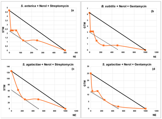 Isobolograms illustrate the interactions of Nerol (NE) with the antibiotics (ABXs) where synergy was detected. The title of each subgraph indicates the bacterium studied along with the composition of the synergy described in the isobologram.The x-axis represents NE concentrations, while the y-axis represents ABX concentrations. The solid line, known as the ‘addition line,’ helps differentiate between additive effects—where points fall on or near this line—and synergistic effects, where concave isoboles are found below it. Additionally, there is a dashed line indicating the boundary of synergy. Points situated above or below this dashed line signify different degrees of synergistic interaction. Concentrations of ABXs and NE in (µg/mL).