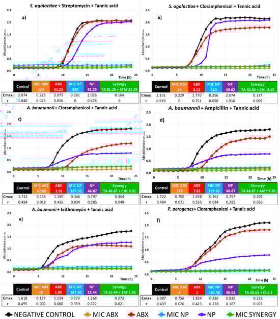 Kinetic assay and Cmax and r values of Tannic Acid (TA) as natural products (NPs), antibiotics (ABXs), and their combinations against different bacteria. The title of each subgraph indicates the bacteria studied along with the composition of the synergy showed in the graph. Black represents the negative control, red represents the ABX concentration in the synergy, purple represents the NP concentration in the synergy, orange represents the Minimum Inhibitory Concentration (MIC) concentration of the ABX, and light blue represents the MIC concentration of the NP. The synergy is represented in green. Error bars indicate standard deviations (n = 4). Concentrations of ABXs and TA in (µg/mL). The color code used is described at the end of the chart.