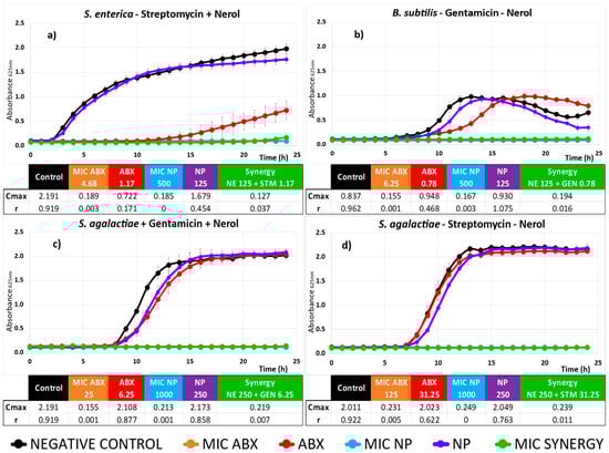 Kinetic assay and Cmax and r values of Nerol (NE) as natural products (NPs), antibiotics (ABXs), and their combinations against different bacteria. The title of each subgraph indicates the bacterium studied along with the composition of the synergy showed in the graph. Black represents the negative control, red represents the ABX concentration in the synergy, purple represents the NP concentration in the synergy, orange represents the Minimum Inhibitory Concentration MIC concentration of the ABX, and light blue represents the MIC concentration of the NP. The synergy is represented in green. Error bars indicate standard deviations (n = 4). Concentrations of ABXs and NE in (µg/mL). The color code used is described at the end of the chart.