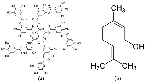 Chemical structure of Tannic Acid (a) and Nerol (b).