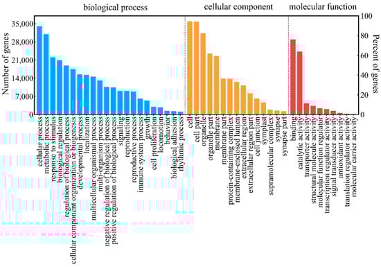 According to the GO classification analysis (Figure 1), a total of 38,941 genes were identified and divided into three categories: biological process (BP), molecular function (MF), and cellular component (CC). In BP, the unique matching sequences were divided into 32 groups, with the highest number of ‘Cellular process’ in biological processes with 34,004 genes, followed by ‘metabolic process’ and ‘response to stimulus’ with 30,989 and 22,126 unigenes, respectively. CC was categorized into 20 groups, with ‘Cell’ and ‘Cell part’ being the two largest groups, containing 35,887 and 35,866 unigenes. For MF, unique sequences were divided into 15 classes. The largest subclass was ‘binding’ with 28,921 genes, followed by ‘catalytic activity’ with 24,282 genes.