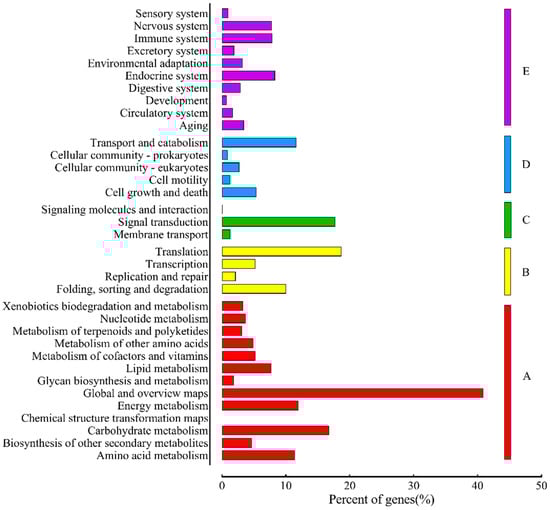 KEGG function classification for M. sativa. The y-axis indicates different KEGG categories and the x-axis indicates the percent of KEGG genes. A: Cellular Process, B: Environmental Information Processing, C: Genetic Information Processing, D: Metabolism, and E: Organismal Systems.