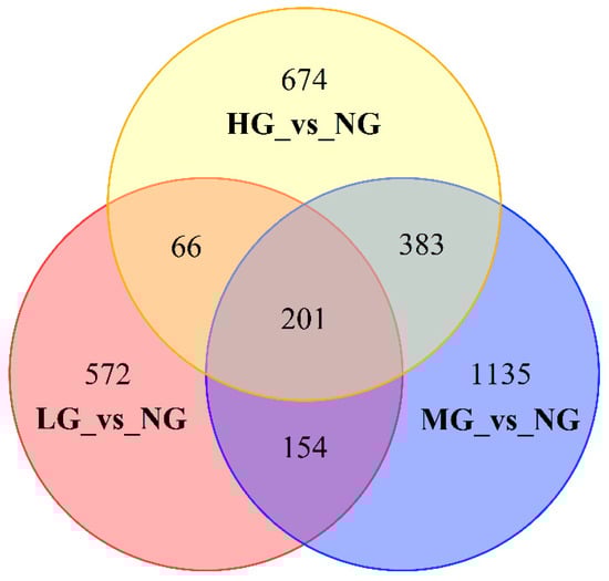 Compared with NG, 991, 1871, and 1322 DEGs were found in LG, MG, and HG, respectively (Figure 3). In our results, a total of 199 unigenes were co-expressed in three comparative manners, while 353 genes were co-expressed in LG-NG and MG-NG, 265 genes were co-expressed in LG-NG and HG-NG, and 582 genes were co-expressed in MG-NG and HG-NG. The types and numbers of co-expression genes may reflect the grazing intensity and responses of M. sativa.