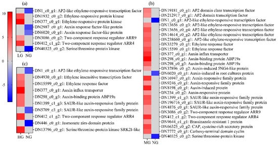 According to KEGG enrichment analysis, the genes related to plant hormone signal transduction pathways were identified (Figure 4). The results showed a total of 45 DEGs, with 10 downregulated and 35 upregulated, including eight, 27, and 10 genes that were enriched in LG-NG, MG-NG, and HG-NG, respectively. Notably, we found three DEGs that were co-expressed in three comparative manners, including upregulated genes AUX1 and ARR-A and the downregulated gene AP2. In LG-NG, there were two ARR genes, three ethylene-related genes, and two auxin-related genes, which play a crucial role in ethylene and auxin biosynthesis and metabolism. In MG-NG, we found three SAUR and nine auxin-related genes in the auxin signal transduction pathway and nine genes involved in ethylene signaling. In HG-NG, we found two SAUR and two auxin-related genes in auxin signal transduction, three genes involved in ethylene signaling, and one gene, JAZ, involved in the jasmonic acid signal transduction pathway.