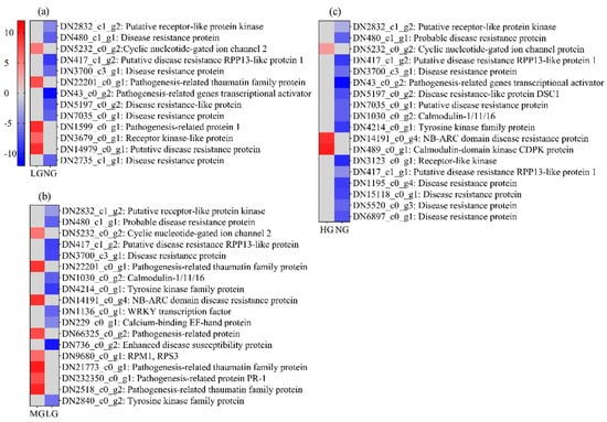 Plant–pathogen interaction pathway-related DEGs in different grazing intensities. (a), (b), and (c) represent LG-NG, MG-NG, and HG-NG treatment, respectively. Red, blue, and gray denote upregulation, downregulation, and no change in expression, respectively.