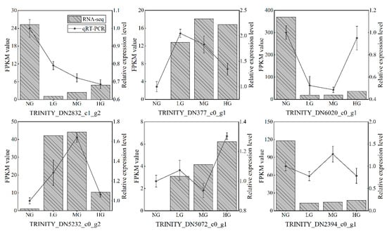 Comparison between the results of qRT-PCR and RNA-seq analyses of selected DEGs. The x-axis represents four treatments involved in non-grazing (NG), light grazing (LG), moderate grazing (MG), and heavy grazing (HG). The left y-axis and the right y-axis indicate the fragments per kilobase per million mapped reads (FPKM) value and the gene’s relative expression levels, respectively.