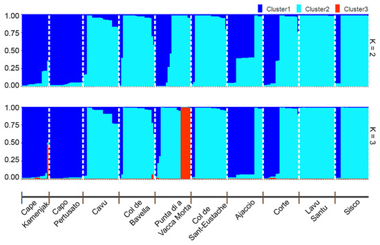 - Pritchard, J.K.; Stephens, M.; Donnelly, P. Inference of Population Structure Using Multilocus Genotype Data. Genetics 2000, 155, 945–959. [Google Scholar] [CrossRef] [PubMed]
