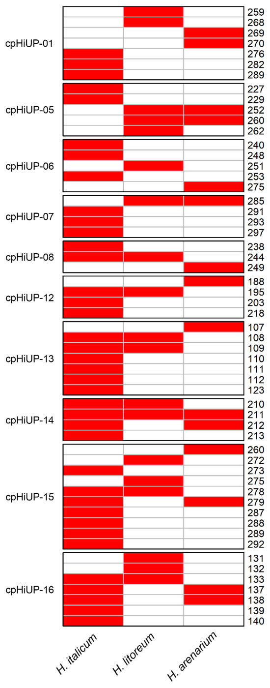 | cpHiUP-05 | (TA)6 | F: *TACTTCTGGTTCCGGCGAAC R: TAGATCCGAACACTTGCCCC | intergenic | 41628–41639 | 228 | 227–229 | PP747102 |