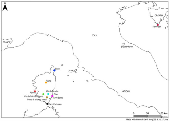 - Ninčević, T.; Jug-Dujaković, M.; Grdiša, M.; Liber, Z.; Varga, F.; Pljevljakušić, D.; Šatović, Z. Population Structure and Adaptive Variation of Helichrysum italicum (Roth) G. Don along Eastern Adriatic Temperature and Precipitation Gradient. Sci. Rep. 2021, 11, 24333. [Google Scholar] [CrossRef]
