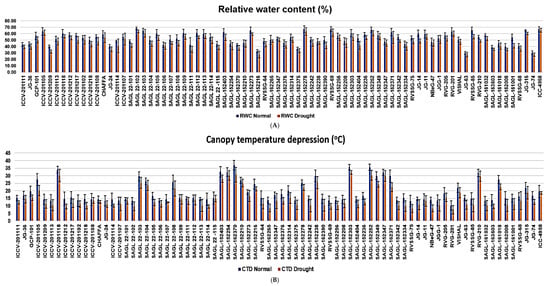 Canopy temperature depression ranged from 10.32 °C to 36.89 °C, with an average of 18.92 °C under normal conditions, whereas under stressed conditions, it ranged from 7.43 °C to 32.12 °C, with a mean of 15.39 °C. Under normal conditions, a higher CTD was observed in genotype SAGL162370 (36.89 °C), while a lower value was recorded in genotype RVG201 (10.32 °C). Likewise, a higher CTD was maintained in genotype SAGL152303 (32.12 °C) under stressed conditions, whereas a lower CTD was recorded in genotype RVG201 (7.43 °C). The minimum reduction in CTD was observed in genotype SAGL 22-115 (0.42), whereas the maximum reduction was noticed in genotype SAGL162371 (7.50) under stressed conditions over normal conditions. Overall, under stressed conditions, the average reduction in CTD was 3.59 °C compared to normal conditions (Table 1 and Figure 1C).