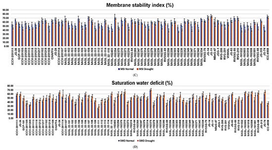 Membrane stability index varied between 48.37% and 74.20%, with a mean of 59.63% under normal conditions, whereas under stressed conditions, it ranged from 35.30% to 73.65%, with an average of 53.05%. In respect to genotypes, under normal conditions, higher MSI in percentage was evidenced in genotype JG11 (74.20%), while the lowest value was recorded in genotype SAGL152404 (48.37%). Higher MSI displayed by genotype JG11 (73.65%) under stressed conditions, while lower MSI was recorded in genotype SAGL152404 (35.30%). The minimum reduction in MSI was observed in genotype JG11 (0.55%), and the maximum reduction in MSI was recorded in genotype SAGL162389 (14.10%) under stressed conditions over normal conditions. Under stressed conditions, the mean reduction in MSI was 6.57% compared to normal conditions (Table 1 and Figure 1D).