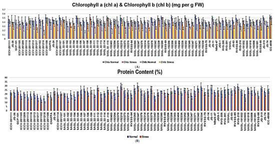 Protein was significantly reduced in all 78 chickpea genotypes under stressed conditions compared to normal conditions, and a significant difference was observed among the genotypes. Under normal conditions, it varied from 15.4% (ICCV 201218) to 30.4% (SAGL152347), with a mean of 23.36%, whereas under stressed conditions, it ranged from 10.24% (SAGL201218) to 28.45% (SAGL152210), with an average of 19.79%. The minimum reduction in protein was observed in genotype ICCV201107 (0.78-fold), SAGL 22-115, and ICCV4958 (2-fold), whilst the maximum reduction in protein was recorded in genotype SAGL22107 under stressed conditions over normal conditions (Table 3). Under stressed conditions, the average reduction in protein was 6.55-fold compared to normal conditions (Table 3 and Figure 2B).
