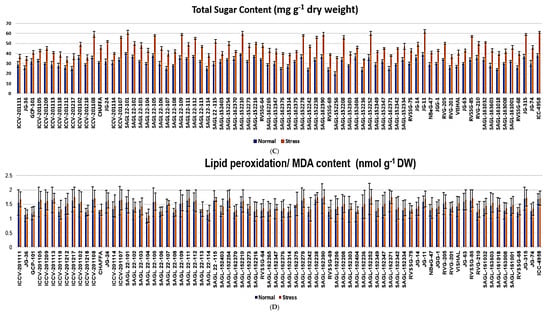 Significant variation was recorded in total soluble sugars estimated in dry chickpea leaves. The maximum sugar content was observed in genotype SAGL22-101 (40 mg g−1 dry weight) and the minimum in SAGL152256 (20 mg g−1 dry weight) under normal conditions, with an average value of 31.30 mg g−1 dry weight. To maintain the cell turgor, the total soluble content was increased under moisture-stressed conditions. Under stressed conditions, the maximum sugar content was observed in genotype JG11 (60 mg g−1 dry weight) and the minimum in ICCV 201212 (34 mg g−1 dry weight), with a mean of 46.32 mg g−1 dry weight. Genotype SAGL152252 showed the maximum increase in TS content of 24-fold under moisture-stressed conditions compared to control conditions. Genotype ICCV201218 showed the minimum TS content under moisture-stressed conditions compared to control conditions (Table 3 and Figure 2C).