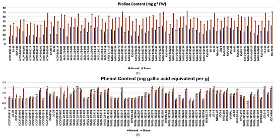 Phenol was significantly enhanced in all 78 chickpea genotypes under stressed conditions compared to normal conditions, and a significant difference was found among the genotypes. Under normal conditions, it varied between 0.57 and 1.86 mg gallic acid equivalent per g, with an average of 1.23 mg gallic acid equivalent per g, whereas under stressed conditions, it ranged from 0.74 to 2.05 mg gallic acid equivalent per g, with a mean of 1.43 mg gallic acid equivalent per g. Under normal conditions, the maximum amount of phenol was evidenced in genotype SAGL152278 (1.86 mg gallic acid equivalent per g), and the minimum in SAGL163603 (0.57 mg gallic acid equivalent per g). Similarly, under stressed conditions, a higher phenol content was observed in genotype SAGL152238 (2.05 mg gallic acid equivalent per g), and lower in SAGL163603 (0.74 mg gallic acid equivalent per g). Phenol content of the leaf increased by 0.03–1.13-fold in drought-stressed genotypes, with a mean of 0.20-fold. A significant enhancement was observed in genotype ICCV201107, which may be considered tolerant to drought, and less of an enhancement in genotype ICCV 201111, which may be considered sensitive to drought (Table 3 and Figure 2F).