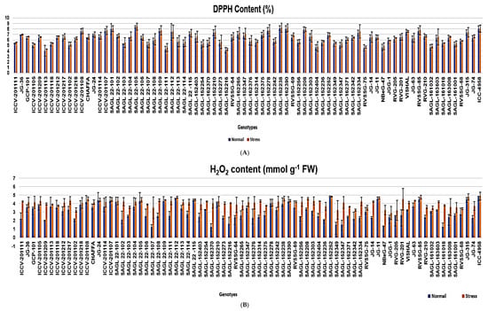 DPPH content was significantly enhanced in all 78 chickpea genotypes under stressed conditions compared to normal conditions, and a significant difference was found among the genotypes. Under stressed conditions, the maximum value was found in genotype SAGL 22-105 (8.41%), and the minimum in SAGL152216 (4.26%), with an average of 6.41, whereas under normal conditions, the maximum value was found in genotype SAGL22-105 (8.32%) and the minimum in genotype ICCV201113 (4.02%), with a mean of 6.22. DPPH content in the leaf increased by 0.04–0.55-fold in drought-stressed genotypes, with an average of 0.19-fold, a significantly greater increase in genotype RVSSG69, and a lesser increase in genotypes such as ICCV201107 (0.04), ICC 4958 (0.04), JGG1 (0.05), JG315 (0.05), and SAGL152208 (Table 4 and Figure 3A).