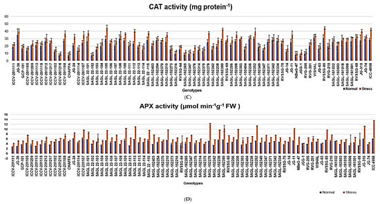 CAT has a role in the decomposition of peroxidase under drought conditions. Under drought conditions, the maximum CAT activity was revealed by genotype SAGL22-105 (44.46 mg protein−1) and the lowest by SAGL22-102 (9.23 mg protein−1), with an average of 26.48 mg protein−1. Nevertheless, under normal conditions, genotype SAGLJG36 (35.02 mg protein−1) had the highest CAT enzyme activity and genotype ICCV201218 (7.42 mg protein−1) had the lowest CAT enzyme activity, with a mean of 20.96 mg protein−1. The highest activity of the catalase enzyme was found in tolerant genotypes. The maximum enhancement of catalase was noticed in genotype SAGL22-112 (17.07-fold) under stressed conditions over normal conditions, while the minimum enhancement of catalase was evident in genotype SAGL 22-102 (1.72-fold), with a mean of 5.52 (Table 4 and Figure 3C).
