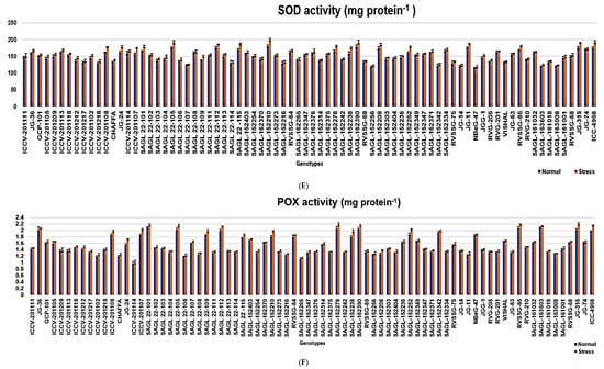 POX activity was significantly enhanced in all genotypes under stressed conditions compared to normal conditions, and a significant difference was found among the genotypes. Under normal conditions, it ranged from 0.98 to 2.09 mg protein−1, with an average of 1.52 mg protein−1, whereas under stressed conditions, it ranged from 1.02 to 2.20 mg protein−1, with an average of 1.59 mg protein−1. Under normal conditions, a higher POX activity was detected in genotype SAGL22-101 (2.09 mg protein−1), and a lower activity in ICCV201114 (0.98 mg protein−1). Likewise, under stressed conditions, a higher POX activity was maintained in genotype JG315 (2.20 mg protein−1), and lower in ICCV201114 (1.02 µmg protein−1). The maximum enhancement of POX was witnessed in genotype JG315 (0.19-fold), and the minimum in SAGL22-113 (0.01-fold) under stressed conditions over normal conditions. Under stress conditions, the average enhancement of POX was 0.07-fold compared to normal conditions (Table 4 and Figure 3F).