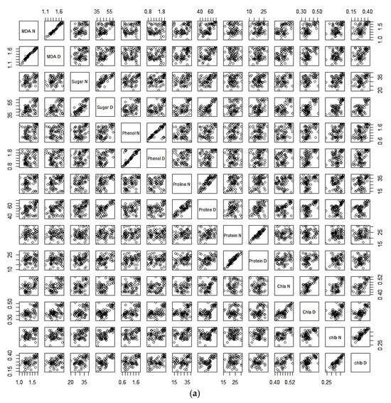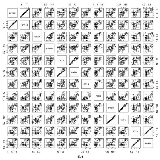 (a) Scatterplot matrix for non-enzymatic biochemical parameters. (b) Scatterplot matrix for antioxidant enzyme activity.