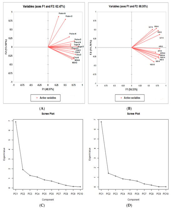 Principal component analysis was carried out for all genotypes, as well as the seven non-enzymatic and six enzymatic biochemical parameters under investigation in each treatment, to better understand the relationship between genotypes and to extract the significant and valuable information present in the data matrix. Additionally, the principal component analysis reduced the number of qualities that accounted for the highest proportion of variability found in the data matrix. More than one eigen value in the major components accounted for about 10% of the overall variation. The principal components indicated that the higher eigenvalues were the most representational of system features [].