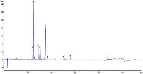The extract’s polyphenolic fingerprinting was assessed using high-pressure liquid chromatography. A Shimadzu LC 20 (Kyoto, Japan) equipped with a 150 mm × 4.6 mm i.d., 2.7 µm Ascentis Express C 18 column, and a diode array detector (DAD) was used for HPLC-DAD studies. H2O/H3PO4 (99:1, solvent A) and MeOH/CAN/H3PO4 (49, 5:49, 5:1, solvent B) were the mobile phases. The gradient that was employed was as follows: 95% of solvent A concentration increased to 77% (34 min), remaining at 77% (3 min), 74% (60 min), 60% (85 min), 20% (90 min), and 0% (92 min). A total of 105 min passed. A constant temperature of 25 °C was maintained in the column. The injection volume was 5 µL, and the flow rate was 1 mL/min. The chromatogram profiles were observed at 280 and 330 nm ± 2 nm and recorded between 190 and 500 nm. All the reference compounds were obtained from PhytoLab GmbH & Co., Ltd. (Vestenbergsgreuth, Germany) [].