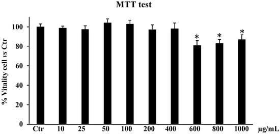 Starting from 600 to 1000 µg/mL a slight decrease (about 15%) in cell viability was recorded. Due to this modest cytotoxic effect at the concentration of 600 µg/mL, we decided to use only the concentrations of 50, 100, and 200 µg/mL for subsequent experiments, as reported in a previous study [].