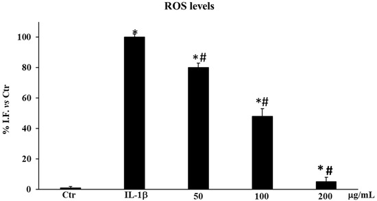 ROS production in HDF untreated cells (Ctr), treated for 12 h with IL-1β (10 ng/mL), and pre-treated for 24 h with the extract (50–100–200 μg/mL). Results are expressed as the percentage of the intensity of fluorescence (I.F.) vs Ctr. Values are the mean ± S.D. of three experiments in triplicate. Confidence intervals calculated by one-way ANOVA test: * Significant vs. untreated control cells: p < 0.05; # Significant vs. IL-1β-Stimulated cells: p < 0.05.