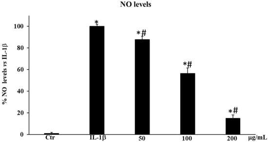 To assess the anti-inflammatory properties of SCF, we measured nitric oxide (NO•) levels in HDF cells non-treated and pre-treated with the three selected concentrations of extract (50, 100, and 200 µg/mL) after 12 h of exposition to IL-1β. Our data showed that the pretreatment with the extract was able to significantly decrease the NO• level compared to HDF cells only treated with IL-1β (* p < 0.05) in a dose-dependent manner, reaching about 85% of inhibition at 200 µg/mL (Figure 6).
