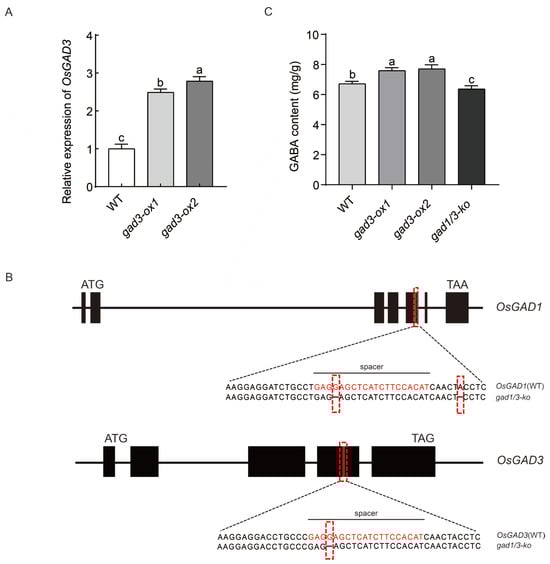 Generation and analysis of genome-edited plants. (A) Expression of the OsGAD3 gene in WT, gad3-ox1 and gad3-ox2. Error bars are SD (n = 3 biological replicates). (B) Schematic diagram of the OsGAD1 and OsGAD3 gene structure and gRNA target site for CRISPR/Cas9-mediated mutagenesis of OsGAD1 and OsGAD3. The black rectangles represent the exon regions. The spacer location is marked in red—nucleotide sequence alignment of WT OsGAD1 and OsGAD3 and the gad1/3-ko mutants. The sequence marked in red text under the black line indicates the spacer sequence. (C) GABA content in germinating seeds of rice of each strain. The OsActin was selected as an internal control to normalise data. Experiments were repeated three times with similar results. Error bars are SD (n = 3 biological replicates). Different letters indicate significant differences at p < 0.05.