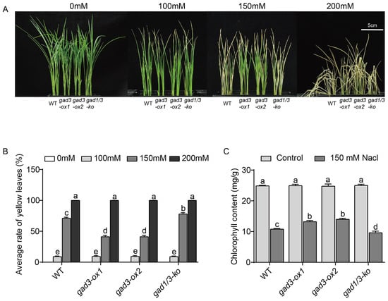 Salinity stress usually severely impedes plant growth [4,13]. To investigate the role of GABA content in rice under salinity stress, three-leaf-stage seedlings of gad3-ox1, gad3-ox2, gad1/3-ko and WT plants were exposed to different concentrations of NaCl for 7 days. The results revealed that 100 mM NaCl had a minor effect on growth but had no effect on the average percentage of yellow leaves in seedlings of the different rice lines. However, 150 mM NaCl caused prominent growth damage, such as leaf chlorosis, wilting and rolling (Figure 2A). The average percentage of yellow leaves of the WT, gad3-ox1, gad3-ox2 and gad1/3-ko plants exposed to 150 mM NaCl was 71.33%, 41.33%, 41.33% and 78%, respectively. Compared with the WT plants, the gad3-ox1 and gad3-ox2 plants presented better growth performance, whereas the gad1/3-ko plants presented worse growth performance (Figure 2). Additionally, the growth of all the genotypes was strongly inhibited upon 200 mM NaCl treatment, e.g., the leaves were completely yellow and withered (Figure 2A). These results suggested that different doses of endogenous GABA in rice resulted in different resistance to salinity.