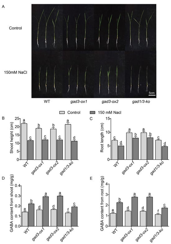 Growth status and GABA content of each strain after 7 days of 150 mM NaCl treatment. (A) Phenotype. (B) Shoot height. (C) Root length. (D) GABA content in shoots. (E) GABA content in roots. The error bars represent SDs (n = 3 biological replicates). Different letters indicate significant differences at p < 0.05. Scale bar = 5 cm.