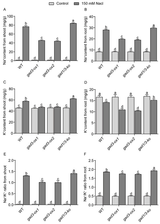 Salt stress can cause the accumulation of Na+ in rice plants and lead to ion imbalance. To maintain ion homeostasis, plants usually reduce the accumulation of Na+ and maintain a low Na+/K+ ratio, which mitigates the damage caused by Na+ toxicity [4,41]. As shown in Figure 4A,B, the Na+ levels in all the genotypes were very low when they were grown under normal conditions. However, the ion contents were markedly increased when the seedlings were grown under the 150 mM NaCl treatment. For each genotype grown under salt treatment, the increase in the Na+ content in the shoots or roots of the two overexpression lines was significantly lower than that in the shoots or roots of the WT and gad1/3-ko lines (Figure 4A,B), suggesting that GABA accumulation in vivo can decrease the Na+ level in seedlings grown under salt treatment. Specifically, the Na+ contents in the roots of the WT, gad3-ox1, gad3-ox2, and gad1/3-ko plants increased 3.38-, 2.36-, 2.27- and 3.59-fold, respectively, under salt treatment, which was consistent with the trend for the Na+ content in the roots. However, the increase in Na+ levels in the roots of each genotype was much lower than that in the shoots.