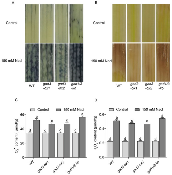 In addition, the O2•− and H2O2 contents in all the rice plants were also quantified. The results revealed that the production of both ROS in the leaves of plants of all genotypes dramatically increased after NaCl treatment (Figure 5C,D). Notably, the increases in both the O2•− and H2O2 contents in gad3-ox1 and gad3-ox2 seedlings were significantly lower than those in the WT, whereas the increase in gad1/3-ko plants was greater than that in the WT, which was consistent with the histochemical staining results.