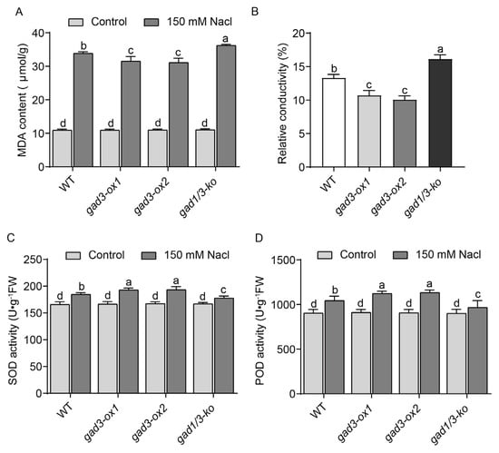Excessive ROS production causes lipid peroxidation and leads to membrane damage. Malondialdehyde (MDA) is the main product of lipid peroxidation, and the MDA content can reflect the degree of membrane damage [42]. As shown in Figure 6A, the MDA content in the leaves of all the rice seedlings grown under normal conditions was approximately 10 μmol/g, whereas, after 150 mM NaCl treatment, the MDA content was significantly increased in the seedlings of all the rice genotypes. Among them, the gad1/3-ko line presented the highest MDA content, whereas gad3-ox1 and gad3-ox2 seedlings presented the lowest MDA content.
