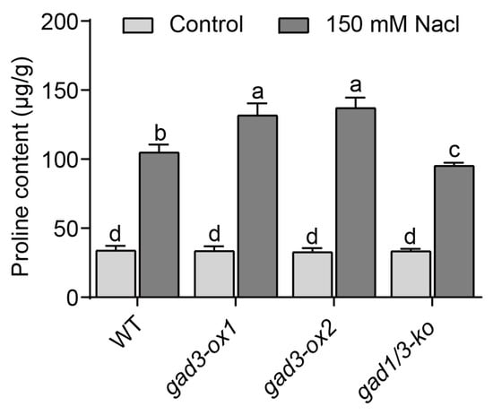 Treatment with a salt solution not only causes ion toxicity in plants but also leads to water stress. In response to water stress, plants synthesise osmotic substances, including proline [43,44]. Therefore, we measured the proline content of each rice genotype. As shown in Figure 7, the proline contents in the leaves of the WT, gad3-ox1, gad3-ox2 and gad1/3-ko plants grown under normal conditions were 33.87, 33.53, 32.70 and 33.36 μg·g−1, respectively. After 150 mM NaCl treatment, this osmotic substance was markedly enriched in all the genotypes. Among them, the increase in proline in the leaves of gad3-ox1 and gad3-ox2 seedlings was significantly greater than that in the leaves of WT plants, whereas the increase in proline content in gad1/3-ko plants was much lower than that in the other lines. These data indicated that the two overexpression lines presented stronger osmotic regulation ability and greater resistance to salt stress.