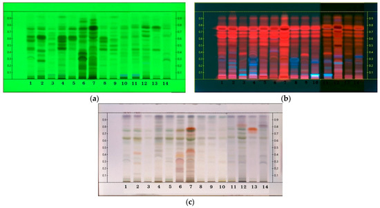 The HPTLC analysis of 14 samples of Peperomia revealed various phytochemicals (Figure 1). The chromatograms from the hexane extracts were obtained after scanning at UV 254 nm (Figure 1a) and UV 366 nm (Figure 1b) and after spraying with anisaldehyde–sulfuric acid reagent (Figure 1c). Different patterns were evident among the 14 species.