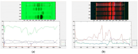 Image of chromatographic plates and corresponding colour scale fingerprints for Peperomia cavaleriei. Fingerprints were generated using TLC Analyzer software and different colour scale selections in (a) fluorescence quenching mode under 254 nm excitation wavelength and (b) fluorescence quenching mode under 366 nm excitation wavelength. Red line—red scale fingerprint (R); green line—green scale fingerprint (G); blue line—blue scale fingerprint (B); grey line—grey scale fingerprint (K).
