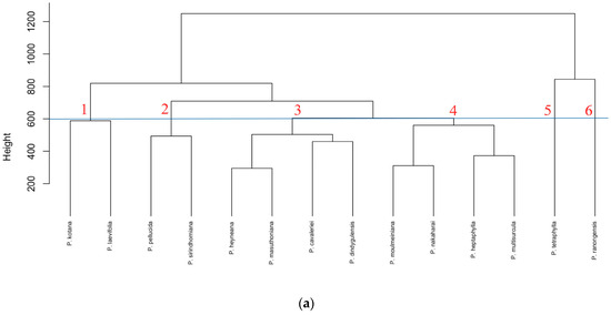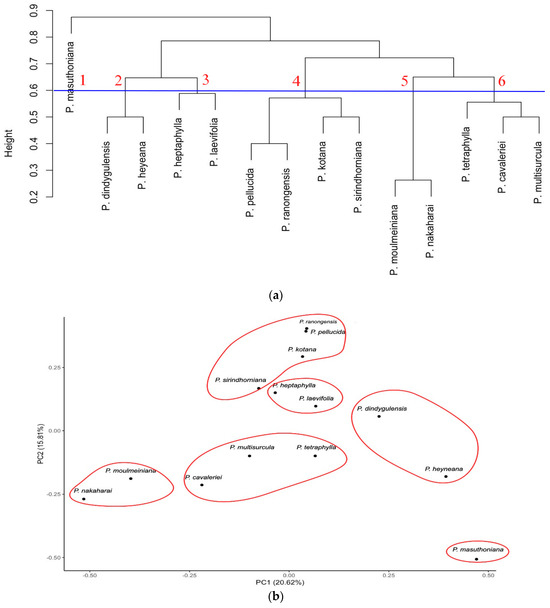 The cluster dendrogram from the GC-MS chemical compound data divided the 14 species into six groups with a distance between the species of 0.6 (height 0.6). P. masuthoniana was separated as a non-grouped individual species (group 1). P. dindygulensis and P. heyneana formed group 2. P. heptaphylla and P. laevifolia formed group 3. Group 4 consisted of P. ranongensis, P. pellucida, P. kotana and P. sirindhorniana. Group 5 consisted of two species, namely P. moulmeiniana and P. nakaharai. Group 6 included P. cavaleriei, P. multisurcula and P. tetraphylla. Subsequent PCA found that the combined PC1 and PC2 axes were able to explain 36.43% of the total variance. The plot shows that the 14 species can be divided into six main groups that were also found in the HCA (Figure 5).