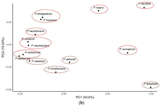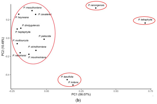 The PCA analysis differed from the cluster analysis, with PC1 and PC2 accounting for a total of 66.56% of the variation. The PCA can be divided into four groups: P. laevifolia and P. kotana were clustered together in one group, P. tetraphylla was separated into an independent group, and P. ranongensis formed its own independent group. Meanwhile, a larger group comprised 10 species (Figure 3b).