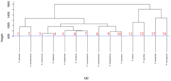 At the distance between the species of 600 (height = 600), it was found that P. tetraphylla and P. ranongensis were distinguished from the other species. Moreover, P. laevifolia and P. kotana were clearly separated from other species. P. pellucida and P. sirindhorniana were also distinguished from the other species in the subcluster. P. masuthoniana, P. cavaleriei, P. heyneana and P. dindygulensis were placed close to each other and belong to the same group in the cluster dendrogram, together with P. moulmeiniana, P. nakaharai, P. heptaphylla and P. multisurcula.